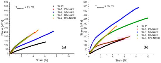 Stress-strain plots obtained by DMA in the stress mode of FIx treated with different NaOH concentrations at (a) 25 °C and (b) 65 °C.