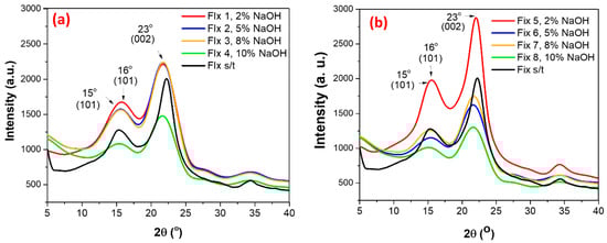 The X-ray diffraction patterns obtained from FIx treated with NaOH at 25 °C and 65 °C are shown in Figure 7a,b, respectively. In the graphs, two main peaks can be observed, which are characteristic of cellulose I. The first peak is broad and has multiplicity at 2θ = 14.88° and 2θ = 16.09°, corresponding to the crystallographic planes (101) and (101), respectively. The second peak is sharp and intense at 2θ = 22.86°, corresponding to the crystallographic plane (002). Additionally, a smaller peak is observed at 2θ = 35°, corresponding to the (040) plane [48,70,71].