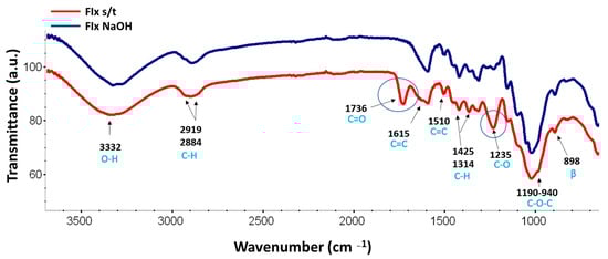 Figure 8 displays the FTIR spectra of untreated FIx and alkaline-treated FIx. The spectra of these samples exhibit absorption bands typical of lignocellulosic fibers in the fingerprint region (1800 to 800 cm−1). In the spectrum of untreated FIx, a peak at 3332 cm−1 is observed, attributed to the stretching vibration of O-H groups. Hydroxyl groups are present in the major components of FIx (cellulose, hemicellulose, and lignin). The peaks at 2919 and 2884 cm−1 are assigned to aliphatic C-H stretching (cellulose and hemicellulose) in symmetric and asymmetric vibrational modes, respectively. Vibrations at 1615 cm−1 and 1510 cm−1 are related to the aromatic rings of lignin. The absorption peak at 1736 cm−1 corresponds to the stretching vibration of the C=O bond in carboxyl groups of hemicellulose, but can also be associated with lignin structure. Furthermore, the band at 1235 cm−1 results from the C-O stretching vibration of the acetyl group in lignin [10,11,24,28,36,71,75,76]. In the Supplementary Material document, Table S1 presents the FTIR signal assignments for the FIx modified by alkaline treatment.