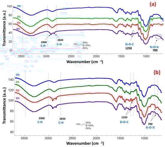 Spectra in Figure 9b show more intense signals at 5% in the 780 cm−1 and 1259 cm−1 bands. This behavior can be explained by a possible grafting of oligomers derived from silane condensation. This is not the case at 8% because increasing the silane concentration promotes condensation over grafting, leading to higher molecular-weight polysiloxanes that can be removed during washing.