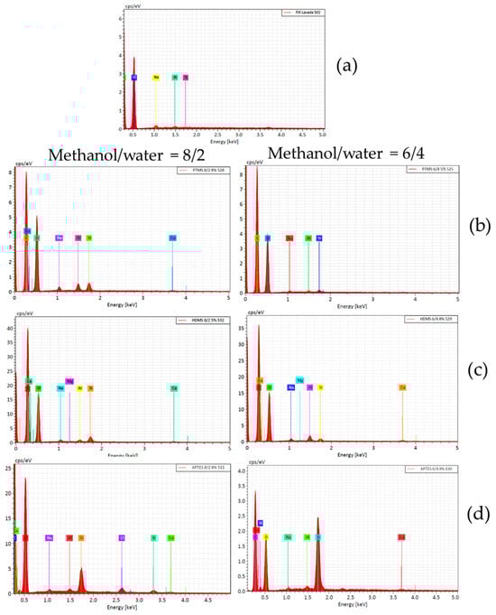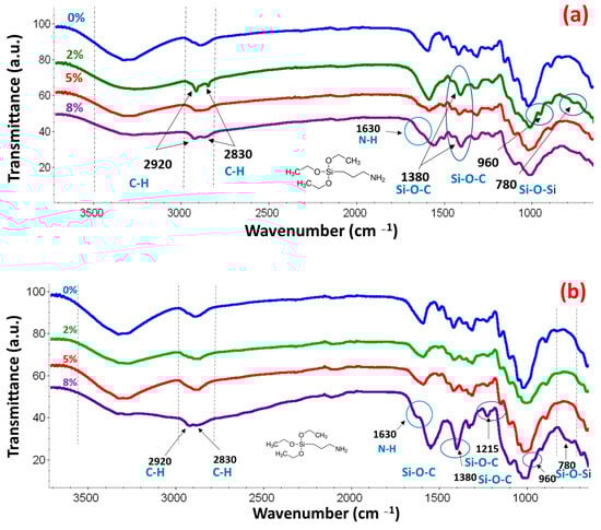 In Figure 10b, the FTIR spectra of FIx treated with APTES using a methanol/water ratio of 6/4 are shown. Notably, only at an 8% APTES concentration is a significant reduction in hydroxyl band intensity observed [36,67,77]. Concerning the peaks associated with APTES, vibrational peaks of aliphatic C-H bonds are noticeable at 2920 cm−1 and 2830 cm−1. Also, the peak at 1630 cm−1 related to NH2 bending deformation modes is more clearly discernible, and a novel peak at 780 cm−1 attributed to the Si-O-Si bond appears [78,80].