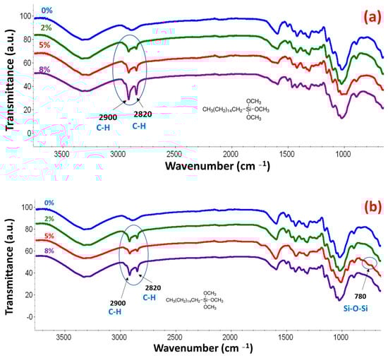 Figure 9a displays the FTIR spectra of FIx treated with PTMS using a methanol/water ratio of 8/2. Comparing it with the untreated FIx spectrum, it was observed that only at the 8% ACSi concentration did a decrease in the intensity of the hydroxyl group band occur, which indicates a successful ACSi grafting reaction under these reaction conditions [35,66,67]. The spectrum of this sample also exhibits peaks at 2900 and 2820 cm−1, assigned to the aliphatic C-H bond of PTMS in symmetric and asymmetric vibrational modes, respectively. Subtle indications of silane grafting are discernible in the FTIR spectra of PTMS-modified FIx at a methanol/water ratio of 8/2. This phenomenon can be attributed to the elevated methanol concentration, which tends to decelerate the condensation reaction, thereby promoting grafting. Consequently, a diminishment in OH groups is discerned, yet the signals corresponding to Si-O-C and Si-O-Si groups exhibit relatively subdued intensities, likely attributed to the grafting of ACSi rather than polysiloxane oligomers.