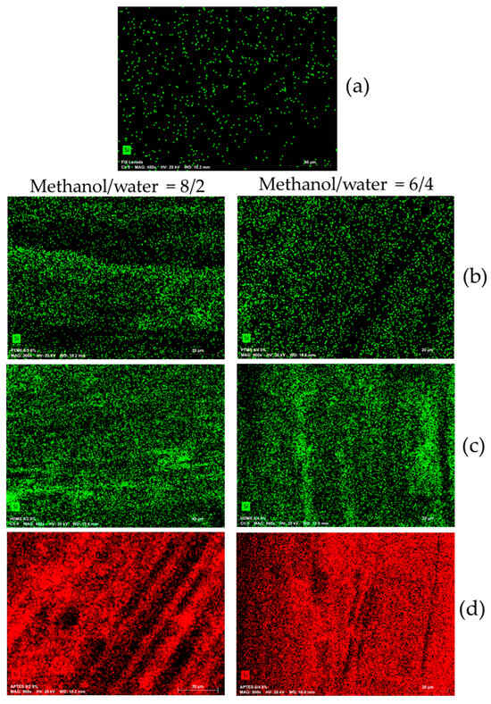 Additionally, peaks are evident in the region of aliphatic C-H bond vibrations at 2920 cm−1 and 2830 cm−1, as well as an additional peak at 780 cm−1 attributed to APTES’s Si-O-Si bonding. Furthermore, new peaks at 1380 cm−1 and 960 cm−1, attributed to symmetric stretching of Si-O-Ccellulose bonds, are evident in this sample, along with an asymmetric stretch of the same bond at 1215 cm−1. Notably, the peak at 1380 cm−1 is more intense in this sample compared to the sample obtained with the same 8% APTES concentration but with an 8/2 methanol/water ratio.