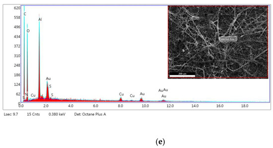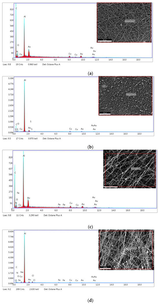 The FEI Quanta 450 FEG (Field Emission Gun) Scanning Electron Microscope (SEM) (Eindhoven, The Netherlands) was used in conjunction with a Secondary Electron Detector to generate high-resolution images of the samples. Energy Dispersive X-Ray (EDS) Spectrometry was used to analyze the elemental composition of samples at an accelerated voltage of 30 kV. The morphology and composition of the PLA/PEO, PLA/PEO/KH, PLA/PEO/PVP, and PLA/PEO/KH-PVP/CH nanofibers were investigated. To mitigate charging effects during SEM imaging, the electrospun nanofiber samples were deposited on a copper band, as a conductive substrate, and coated with a conductive layer of Au measuring approximately 5 nm in thickness.