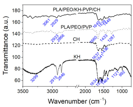 The FTIR spectra of the samples were analyzed in order to assess the presence of functional groups associated with KH, CH, PLA, PVP, PEO, and PVP and their interaction in the assembled biomaterial (Figure 4).
