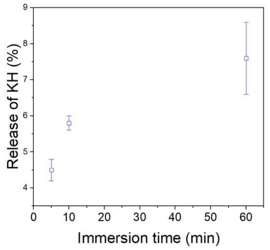 The cumulative release of KH protein from PLA/PEO/KH-PVP/CH nanofibers indicated the following data for 5 min, 10 min, and 60 min of immersion in distilled water: 4.5% ± 0.3%, 5.8% ± 0.2%, and 7.6% ± 1%, respectively (Figure 5).