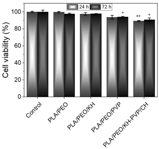 The quantitative MTT assay results showed a significant level of cytocompatibility for all tested nanofiber samples (Figure 6). Following 24 h of cell incubation with the samples, cell viability exceeded 80%, indicating a non-cytotoxic effect. Cell viability ranged from 89.29% for PLA/PEO/KH-PVP/CH to 99.77% for PLA/PEO. After 72 h, cell viability slightly increased for almost all the samples, with values surpassing 90%. The highest recorded percentage of cell viability was observed for PLA/PEO/KH (97.87%), while PLA/PEO/KH-PVP/CH exhibited a percentage of 90.88% (as shown in Figure 6).