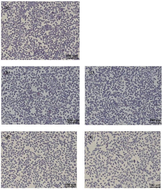 This study also examined the morphological characteristics of NCTC cells grown in the presence of nanofiber samples. Following Giemsa staining, the cells were observed under a light microscope. After 72 h of treatment, the cells retained their typical morphology, which closely resembled that of the control. They displayed a fibroblast-like phenotype characterized by a well-defined cytoplasm, cytoplasmic extensions, and euchromatic nuclei with multiple nucleoli (Figure 7). The cell density in the treated nanofiber samples was comparable to that of the control, with cells covering approximately 85% to 90% of the well’s surface.