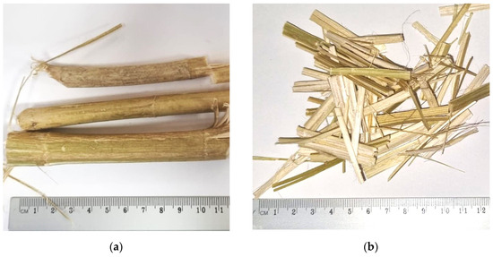 Hemp fibers (HF) were extracted from industrial hemp Cannabis sativa (USO-31). After the decortication, the hemp stems (Figure 1a) were air-dried and cut into 30 × 7 mm pieces (Figure 1b,c). The hemp biomass then was cooked in 4% NaOH solution at 165 °C for 75 min in a 2 L laboratory digester with a warming up speed of 2 °C/min. After the cooking fibers were washed in tap water to a residual water pH of 7 and refined to 18 ºSR freeness using the Blendtec 725 (Orem, UT, USA) at 179 W for 7 min at 1.5% consistency, then dried at room temperature and kept in a dry state until used (Figure 1d). The total yield of fibers was 49.4%, calculated using the mass of the initial stem biomass.