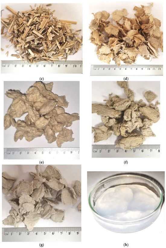 Industrially recycled pulp provided by local molded fiber products company SIA “V.L.T.” was used in the research as waste fibers (WF). Two batches (WF and WFc) were provided with a distance of two weeks to investigate if properties vary. According to the pulp provider, WF consisted of 60% mixed waste paper (newspaper, journals, books, office paper, cardboard, packaging paper), 30% waste cardboard, 5% printing house waste, and 5% waste from the production process of egg packaging. WF (Figure 1f) and WFc (Figure 1g) pulp was dried at 40 °C until dry and kept in a dry state until used.