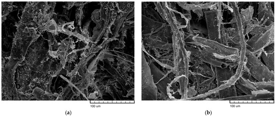 Softwood kraft fibers’ characteristics were in line with the numbers for ordinary kraft pulp revealed by other authors [47,48,49]. SEM revealed the smooth, undeveloped surface of chemically released wood fibers (Figure 2c).