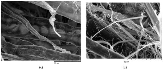 Scanning electron microscopy of fibers used for paper compositions: (a) Waste fibers WF, 1000×; (b) Waste fibers WFc, 1000×; (c) Kraft fibers KF, 2000×; (d) Hemp fibers HF, 3000×.