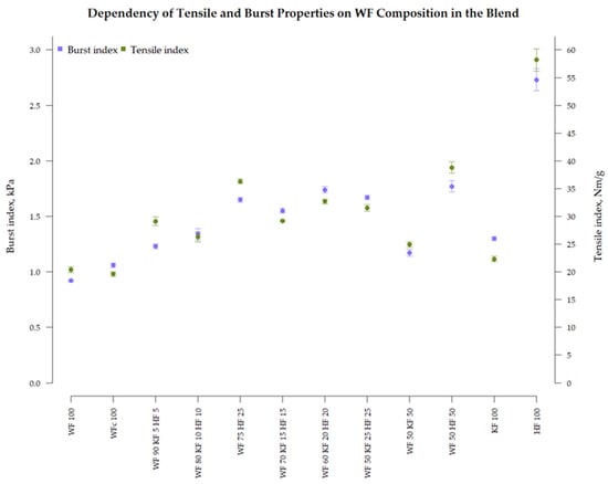 When comparing dry state mechanical properties such as burst index and tensile index, there were significant differences among the samples (Figure 5). The addition of 10% mixed virgin fibers (5% KF + 5% HF) increased the burst index by 34% and tensile index by 43%, if compared to paper consisting only of waste fibers. This result was comparable with an addition of 50% of KF to the waste fiber paper, creating the space for discussion on whether it is reasonable to add more single-blend virgin fibers or less mixed virgin fibers from different sources when creating new paper compositions. When 20% mixed virgin fibers (10% KF + 10% HF) were added, there was a 45% increase in burst and a 28% increase in tensile index, and the result was comparable with the addition of 25% KF. However, in the case of adding 25% virgin fibers to the recycled fibers, a very significant increase was demonstrated by HF presence, resulting in a 79% increase in burst index and a 78% increase in tensile index compared to the initial waste fiber material. The addition of an equal amount of KF increased the tensile index by 33% and the burst index by 49%, which is a significantly lower improvement if compared with HF. The identified excellence of HF over KF was also visible in the case of the replacement of 50% of waste fibers. The use of 50% HF improves mechanical performance almost twice (92% for burst index and 90% for tensile index), while 50% KF provided improvements of 27% and 22%, respectively. The addition of mixed fiber (25% KF + 25% HF) provided an 82% increase in burst and a 54% increase in tensile strength performance. The results allow us to conclude that HF or mixed fibers are better options for the improvement of recycled papers than KF. The superior properties of HF fibers are also shown as high results of HF100 papers (Figure 4 and Figure 5), which reached a 2.29 kPa burst index and a 49.3 Nm/g tensile index. The performance of HF can be attributed to its size and structure, which differs from wood fiber by being thinner and shorter (Table 1). Different authors reflect on the diverse properties of hemp fibers. Highly fibrillated HF paper in a dry state reached a tensile index of 60.4 Nm/g with a fiber freeness of 91.5 ºSR [57], while in other research, hemp hurd fibers were assessed as suitable for fiber blends and expected to have lower strength compared with typical wood pulp fibers [32]. Gumuskaya et al. [51] claim hemp fibers to be difficult to delignificate, resulting in poor papermaking and mechanical pulp properties, whereas Pal and Lucia [32] report that industrial hemp has favorable features as a pulp resource. The thinness characteristics of hemp hurd fibers enhance the penetration of pulping liquids; furthermore, weaker chemicals can be used for pulping and fibrillation. The excellent mechanical performance of HF in the current research can be attributed to the mechanical posttreatment to 18 ºSR freeness, which apparently, has developed a sufficient fiber surface to create strong bonds with recycled and kraft fibers, resulting in papers with outstanding mechanical properties.