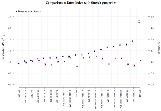 Comparison of burst index and stretch characteristics of fiber blends; samples are sorted in ascending order according to burst index.