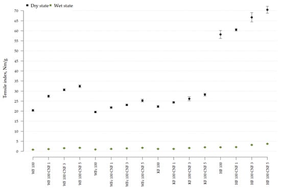 Created fiber combinations were tested for tensile index Nm/g, stretch %, and breaking length km both in the dry and wet state; however, as shown in Figure 4, the differences among samples in the wet state were rather insignificant. Due to the above-mentioned fact, as well as the fact that the values were extremely low, the wet mechanical test results were not further used to investigate and compare the effect of fiber additives and CNF additives on paper properties. It is known that paper strength is based on the bonding strength of fibers; however, natural cellulose fibers without any wet strength agent are easily swelled by water, and the bonds are damaged, which causes poor wet strength [52]. To improve the mechanical performance of wet paper, wet strength agents are added, recently tending more toward natural ones, such as chitosan [53,54], polyelectrolyte complex of polysaccharides [55], cationized birch xylan [56], and other biobased substances.