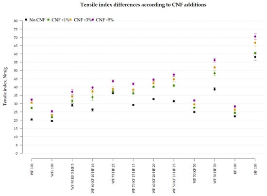 Tensile index of single blend fiber materials with CNF additive.