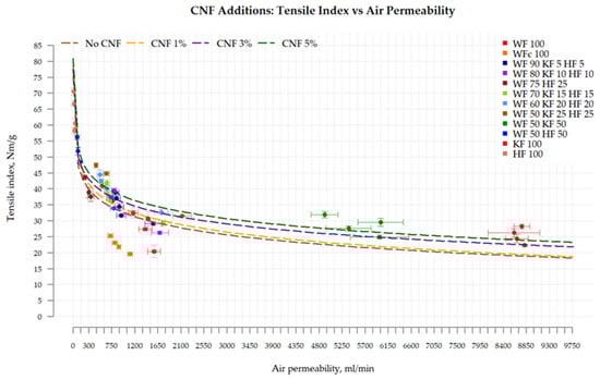 When searching for the correlation between mechanical properties and air permeability among all investigated compositions, including with added CNF, it is evident (Figure 10) that at higher tensile indexes, there is a tendency for air permeability to decrease. Such behavior is typical for porous fiber materials and reflects the fiber bonding ability and efficiency, which is more intense when CNF is added. The data trend exhibits a logarithmic behavior, allowing for the prediction of material property alterations based on composition changes and the proportion of added CNF.