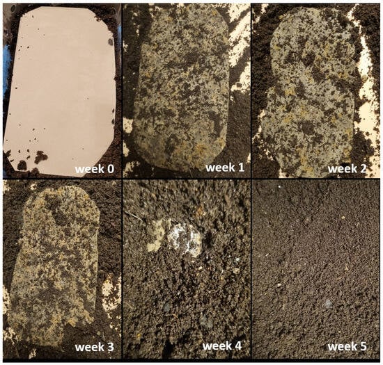 Because developed fiber materials were intended for packaging applications, the biodegradation test was organized as a trial of the disintegration of packaging material in a pilot-scale aerobic condition, according to adapted EN 14045:2003 [46]. The test included a 12-week composting procedure with weekly inspections of the sample and weighting residual nondegraded particles of material at the end of the test. As could be expected, all the papers were degraded during the test, in week 4 and week 5. Figure 11 shows the degradation progress of sample WF 50 KF 50, which was randomly selected for the representation of all inspected fiber samples in the manuscript because all fiber combinations showed similar biodegradation results. According to the results (no residual sample was detected after a 12-week test), all materials were recognized as fully biodegradable and home-compostable. The test can be considered equivalent to home composting because the temperature varied from 22 °C to 24 °C and moisture varied from 70 to 77% in the compost media during the test.