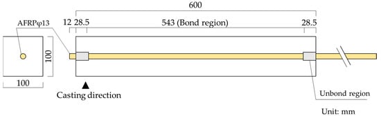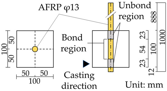 | MT-A | Height: 100 mm Bond length: 54 mm (=4d) Reinforcement: Braided AFRP bar (Diameter 13.58 mm) Fiber type of FRCC: PVA | 100 mm × 100 mm (A series) | - | 3 |