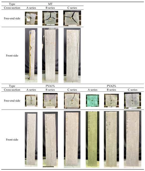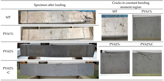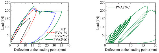 - The bending test results for AFRP/PVA-FRCC beam specimens showed that the number of cracks increased with the increases in fiber volume fraction. The maximum loads recorded for each type of specimen were as follows: MT: 154 kN; PVA1%: 217 kN; PVA2%: 198 kN; and PVA2%C: 229 kN. In the case of specimens with a fiber volume fraction of 2%, the load reached its maximum value due to the compression fracture of the FRCC, and cyclic loading had no discernible effect.