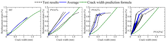 - The adaptability of the crack width prediction formula, considering the bond constitutive law and the fiber bridging law with respect to PVA-FRCC, was discussed. The reinforcement strain–crack width relationship obtained from the bending test exhibited good compatibility with the crack width prediction formula.