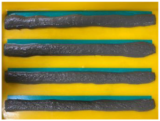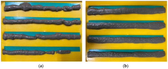 For this study, a peristaltic pump (WS-300, Tohama Co., Ltd., New Taipei City, Taiwan) was used to squeeze out the cementitious mortar to perform the extrudability test. The set speed was 40 rpm and the nozzle diameter was 12.7 mm. The extrudability was defined as the ability of the cementitious mortar to pass through the soft pipes and nozzles of a peristaltic pump, based on the method proposed by Le et al. [32]. Continuously extruded cement mortar in the form of four parallel lines (300 mm each) was used as the extrudability test metrics in this study, as shown in Figure 3. The test results were categorized as “Pass” or “Fail” based on whether the cementitious mortar was successfully deposited over its entire length without clogging or cracking.