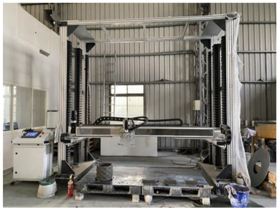 A contour crafting 3D printer (UMAS Technology Co., Ltd., Taichung, Taiwan) was used to print the CFRCM specimens. The contour crafting 3D printer had dimensions of 2 m × 2 m × 2 m, as shown in Figure 4. The diameter of the nozzle was 15 mm, and the printing speed was set at 45 mm/s ± 5 mm/s.