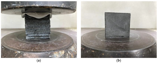 After mixing, 3D-printed specimens and molded specimens were prepared. The compression test method was based on ASTM C109/C109M-20 [66]. The size of the compression specimen was 50 mm × 50 mm × 50 mm. Figure 5a,b show the experimental procedure for the 3D printed specimen and cast specimen compression tests, respectively. The specimens were cured in a water tank and tested at 7th and 28th days of age to determine the change in strength over time. Each test group had three specimens.