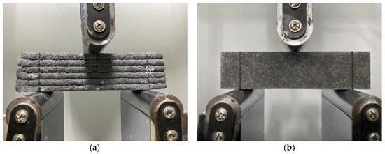 The flexural test method was based on ASTM C293/C293M-16 [67]. The size of the bending specimen was 40 mm × 40 mm × 160 mm. Each test group had three specimens. Figure 6a,b show the experimental procedure for the 3D-printed and cast specimen flexural tests, respectively. The specimens were maintained in a water tank and tested at 7th and 28th days of age to test the change in strength over time. Since the 3D-printed flexural specimens were printed layer by layer, the printed sizes were different, the cross-sectional area of each bending specimen was measured, and the moment of inertia of the cross-section was calculated. The flexural strength () in MPa was calculated using Equation (1):