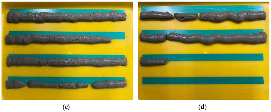 The extrudability of the four #16 sieve weight ratios: (a) S1.6; (b) S1.2; (c) S1.0; (d) S0.