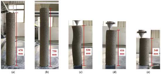 This subsection explains how the fluidity of the CFRCM was maintained by adding superplasticizers to test the buildability of 25-layer CFRCM hollow cylinders with varying additions of chopped carbon fiber (2.5 vol.‰, 5 vol.‰, 7.5 vol.‰, and 10 vol.‰) at a fixed cement accelerator dosage of 6 wt.%. The printing speed ranged from 45 ± 5 mm/s per layer. Table 5 lists the heights of hollow cylinders built using CFRCM with different carbon fiber additions. Figure 8 showcases the effect of different carbon fiber additions in meeting buildability requirements through the construction of hollow cylinders. In Figure 8a, the foundation specimen without fiber (SP1.6-A6B) achieved a buildable height of 670 mm, while Figure 8b demonstrates a buildable height of 750 mm using 2.5 vol.‰ of CFRCM (SP1.7-A6CF2.5). Both cases exhibited no noticeable deformation. However, Figure 8c shows a reduced buildable height of 530 mm when using 5 vol.‰ of CFRCM (SP1.9-A6CF5), with significant collapse observed. In contrast, Figure 8d,e reveal buildable heights of 416 mm and 340 mm, respectively, for CFRCM additions of 7.5 vol.‰ (SP1.9-A6CF7.5) and 1.0 vol.‰ (SP2.3-A6CF10), but both experienced collapses.