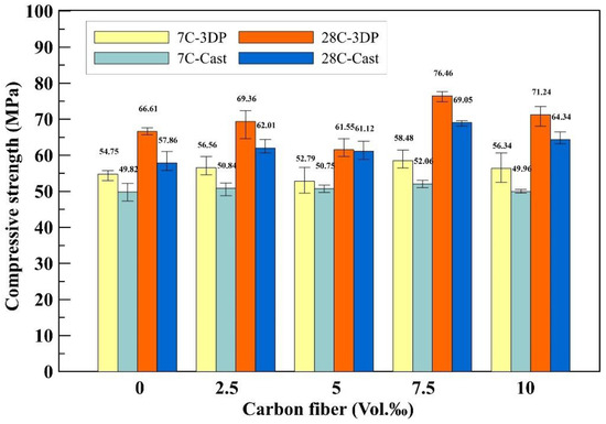 - The compressive testing results revealed that both 3D-printed and cast specimens exhibited the highest compressive strength of CFRCM when using 7.5 vol.‰ chopped carbon fiber, resulting in strength improvements of 15% and 19%, respectively. The compressive strengths of the 3D-printed and cast specimens ranged from 57.86 MPa to 76.46 MPa.