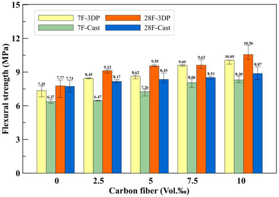 Figure 10 illustrates the 7th day and 28th day average flexural strength results for 3D-printed and cast CFRCM with varying fiber volume additions. Both 3D-printed and cast specimens with a 10 vol.‰ CFRCM exhibited the highest flexural strength. The flexural strength increased with the amount of added carbon fiber. According to the test results, the 7th day flexural strength of the 3D-printed specimens was slightly higher than that of the cast specimens. The average flexural strength of both the 3D-printed and cast specimens ranged from 6.37 MPa to 10.05 MPa. Similar to the 7th day results, the average flexural strengths of the 28th day specimens increased as the amount of carbon fiber added increased. The 28th day flexural strengths of both the 3D-printed and cast specimens ranged from 7.73 MPa to 10.56 MPa.