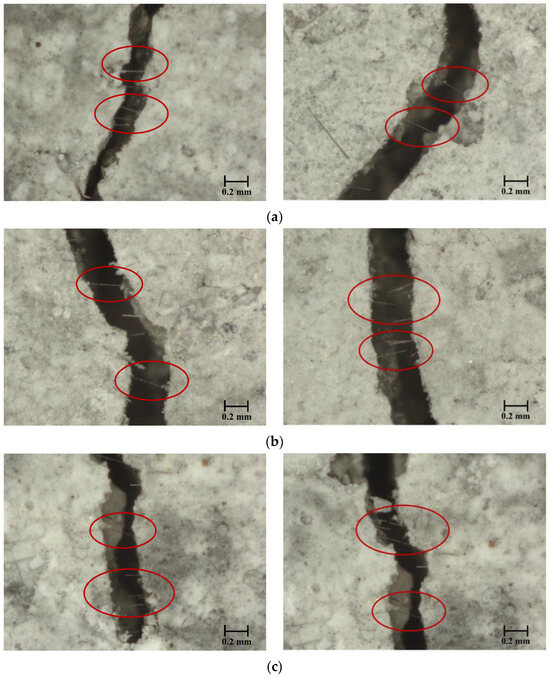Optical microscope images of the 3D-printed flexural specimen’s failure mode, the red circles point out the carbon fiber locations: (a) F-CF5-3DP; (b) F-CF7.5-3DP; (c) CF10-3DP.