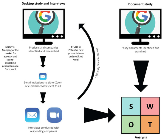 This paper presents data concerning products made of wool collected during two series of desk research and interviews, combined with a document analysis examining policy and definitions concerning the use of wool in the EU. For the analysis, a SWOT method was applied. The research design is illustrated in Figure 1.