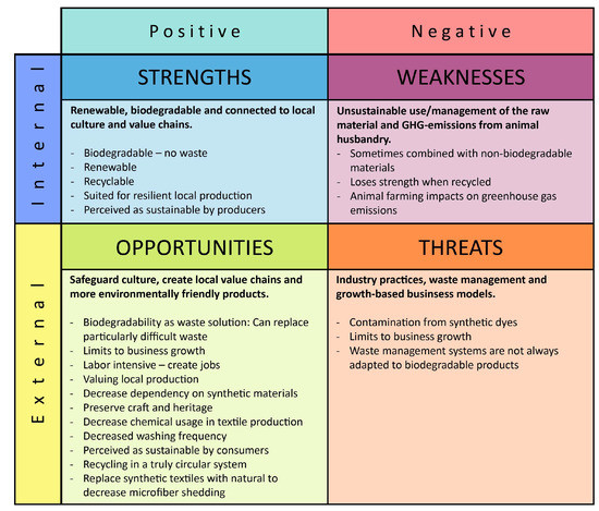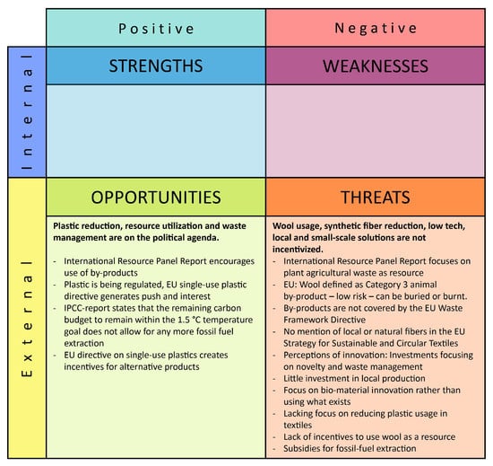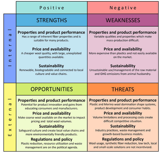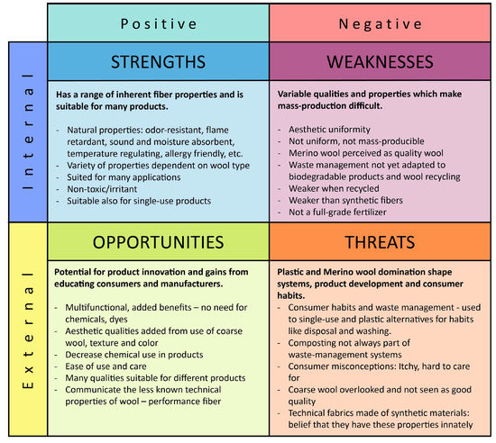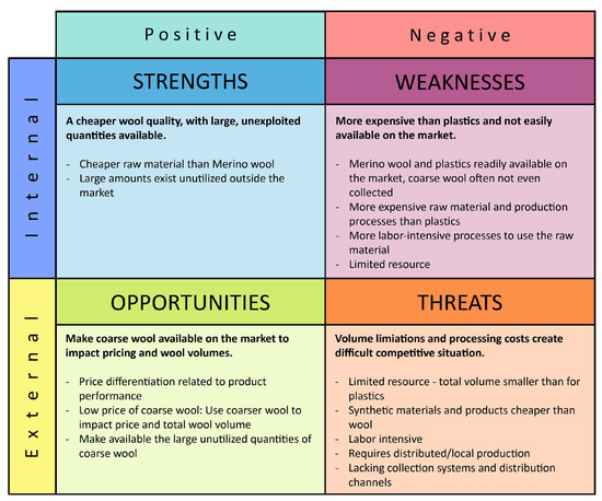 A SWOT analysis is a business strategy tool used to identify internal strengths and weaknesses, alongside external opportunities and threats [89]. The explicit inclusion of internal factors and categorization of aspects in terms of expected impact (positive or negative) in the model facilitates strategic planning and decision-making [90]. It is also a useful tool to give an overview of and communicate the situation of the entity analyzed [90]. The method was chosen to provide a holistic view of the business situation of the coarse wool to explain the low usage.