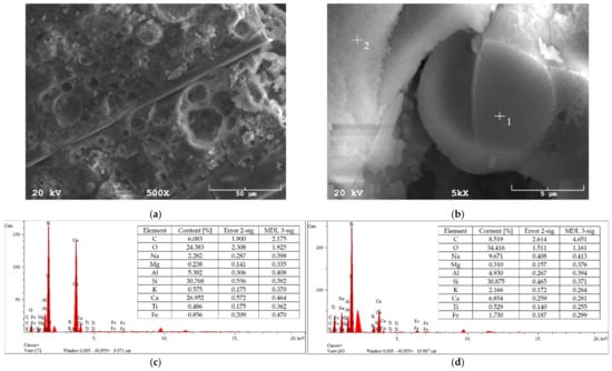 Scanning microscopy of short fibers in the geopolymer matrix. (a) Description of what is contained in the first panel; (b) description of what is contained in the second panel; (c) EDS analysis for point 1; (d) EDS analysis for point 2 [].