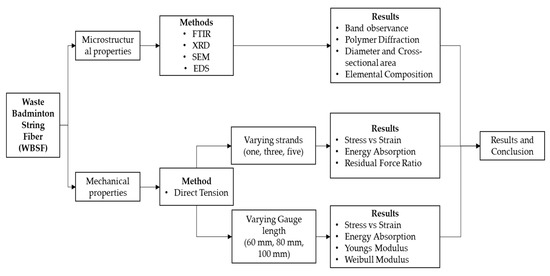 In this study, old and new fibers are examined in terms of their microstructural and mechanical properties. Mechanical characteristics include the tensile strength of the fiber with varying strands (one, three, and five) and varying gauge lengths (60, 80, 100 mm) with reference to Majid Ali et al. [30] to study the energy absorption of the fiber and ASTM C-1557 [31] to study the Young’s modulus of the fiber, respectively. To determine the tensile stress of old and new fibers, the net cross-sectional area is calculated as it plays a major role. The performance of the fibers with varying strands is determined by energy absorption, whereas the performance of the fibers with varying gauge lengths can be determined by the direct tensile stress. The force distribution for fibers with varying strands (three and five) is determined by the residual force loss ratio. The Weibull distribution approach is used to determine the variability of the test results. The methodology is shown in Figure 2.