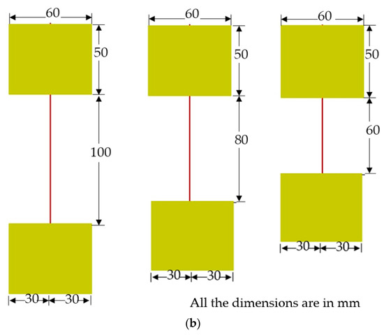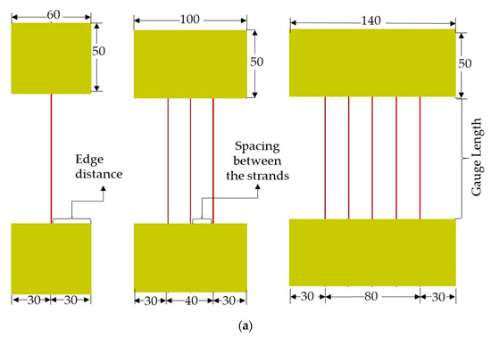 For the condition of varying strands (one, three and five), the gauge length was fixed as 100 mm and the edge distance and spacing between the fibers was maintained as 30 and 20 mm, respectively. For the condition of varying gauge lengths (60, 80 and 100 mm), the number of strands was fixed as a single-strand and the edge distance was maintained as 30 mm. The test specimen for varying conditions is shown in Figure 3.