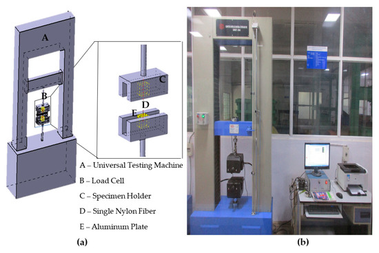 The tensile test was conducted in computer-controlled universal testing machine, as shown in Figure 4. Testing was performed for samples with varying strands of the fibers and varying gauge lengths at a constant strain rate of 1 [37] and 2 mm/min [38], respectively. The fracture load was extracted with a load cell of 250 kg in capacity. The data acquired from the system are within ±1% standard uncertainty.