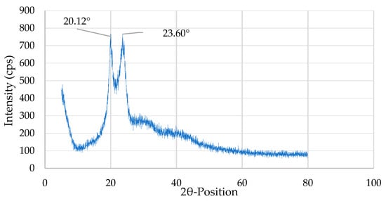 From the XRD pattern, two main high peaks of 2θ = 20.12° and 23.60° are visible. From this, the α-crystalline form is observed in both the high-intensity peaks, i.e., 2θ = 20.12° and 23.60°, and the γ-crystalline form is observed in the 20.12° peak. These results indicate that the crystalline structure of polyamide 6,6 is revealed [42], as shown in Figure 6.