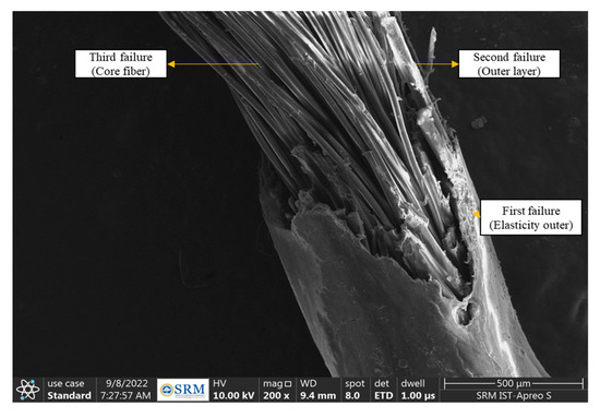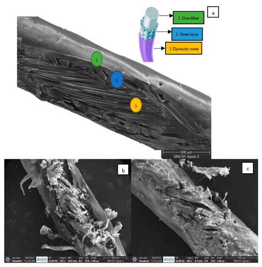 The SEM image of the fibers reveals three distinct layers (an outer layer, an intermediate layer, and an inner layer) which are referred to as the elasticity outer, the outer layer, and the core fiber, as shown in Figure 6. In the grid system arrangement in the racquet, these fibers are subjected to more stretch. These three layers of the fibers help to withstand the high tension due to stretch. Figure 7b,c shows the SEM image of the fibers from the sweet spot of the racquet system. From the SEM image, it was noticed that only the elasticity outer and the outer layer are affected and the core fiber remains undisturbed. The elemental composition of the fiber layers is tabulated in Table 2.