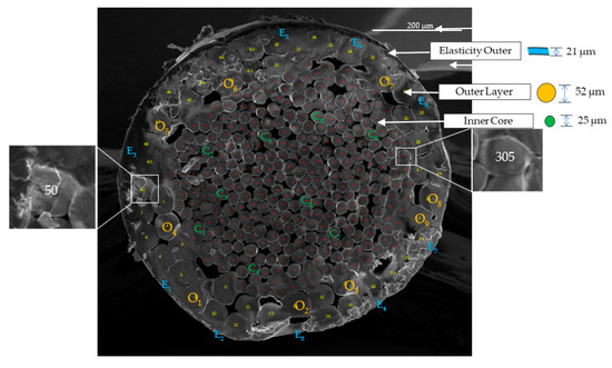 The cross-section of the entire fiber and the microfibers in the outer and core are reasonably circular. Figure 8 shows the close image and arrangement of microfibers in the outer layer and the core fiber [44]. To characterize the diameter and area of the fiber, ImageJ software is used [45,46]. The net cross-sectional area of new and old fibers is required to determine the tensile stress and Young’s modulus of the fibers. For which, three individual sample fibers are cut in an exactly perpendicular manner and are kept vertically to perform SEM. From the SEM image, as shown in Figure 9, the cross-section borderline is traced carefully using ImageJ software. The net cross-section of the fiber is determined by deducting the area of voids from the overall cross-section of the fiber. The comparison of the net cross-sectional area of old fibers (O) and new fibers (N) is tabulated in Table 4.