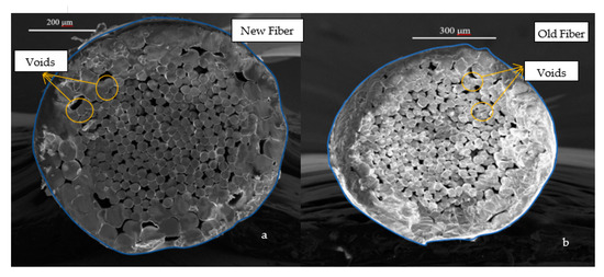 - From the SEM imaging of the fibers, the overall diameter and the net cross-sectional area are 799.10 μm and 504,786.30 μm2, respectively, for new fibers and 776.30 μm and 498,125.00 μm2, respectively, for old fibers.