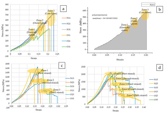 (a) Stress–strain curve for one strand. (b) Energy absorption of the fiber. (c) Stress–strain curve for three strands. (d) Stress–strain curve for five strands.