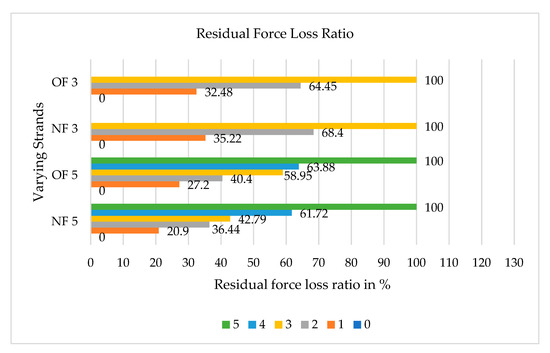 In multi-strand fibers, the ultimate force is reduced as the individual fibers show successive failure at different stages. A loss of force is observed due to the distribution of ultimate stress among the fibers in the strand. Thus, a better understanding of force distribution in fibers is gained by calculating the residual force loss ratio using the Equation (1) [48],