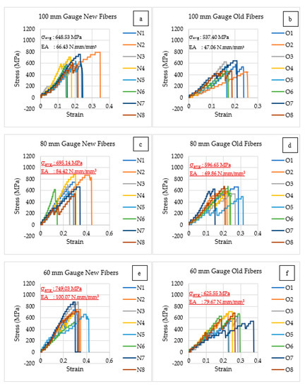 Many samples of new and old fibers with 60, 80 and 100 mm gauge length were considered for this study. The results are discussed considering two different conditions—the same gauge length with different fibers and the same fiber with different gauge lengths. The stress–strain relationship of these fibers was discussed based on the successful results of eight samples under each category given in (Supplementary Table S2).