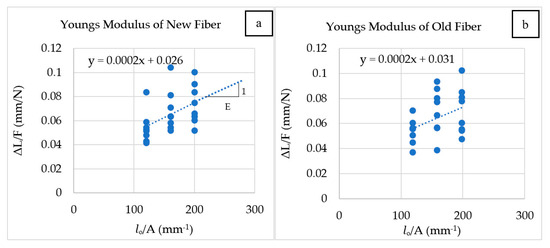 Young’s modulus: (a) new fibers; (b) old fibers.