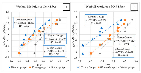 Weibull modulus: (a) new fibers; (b) old fibers.