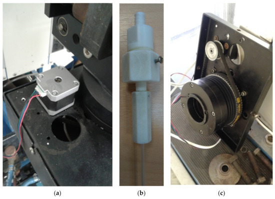 Previously performed modifications to the drawing tower feed unit: (a) top of the feed unit with installed stepper motor that rotates a preform under desired speed; (b) completed and jointed fluoroplastic rotational adapter with installed MOF cane; (c) removed supporting pad with stepper motor and its driving system.